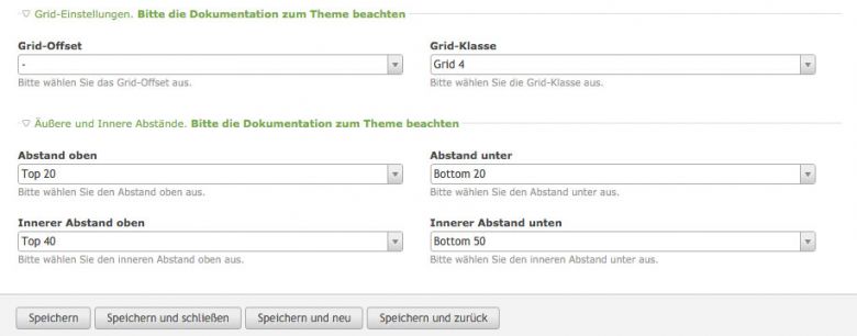Grid-Klassen und Abstände können in jedem Inhaltselement (meinen eigenen und den Standard-Elementen) über select-Menüs ausgewählt werden!